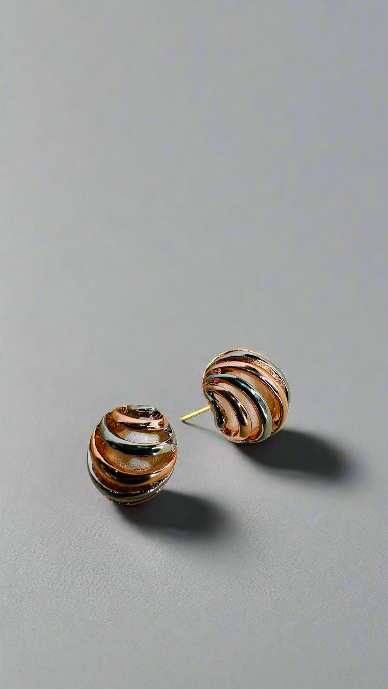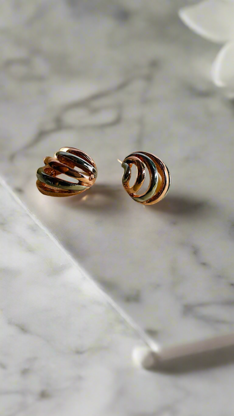 These earrings are a study in contrasts—a dance of polished rose gold, silver, and classic gold threads swirling together to create a miniature masterpiece.