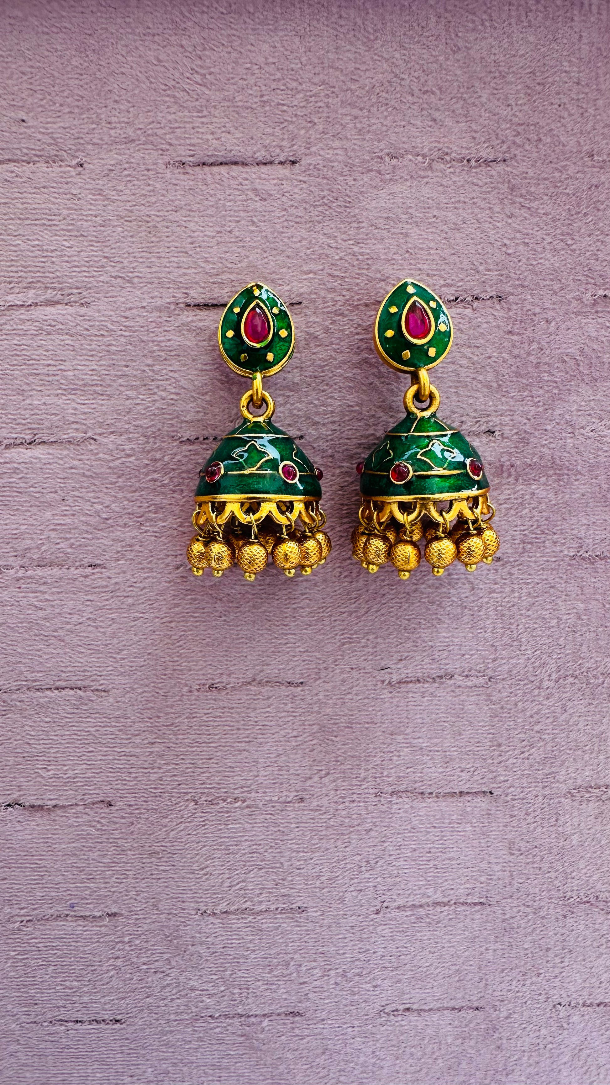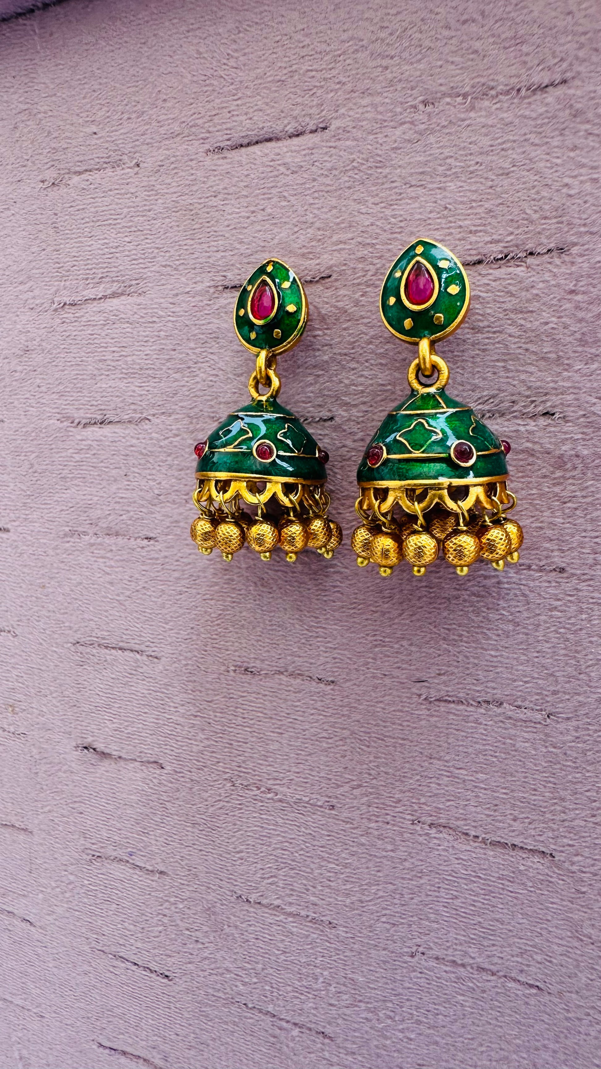 These elegant jhumka earrings feature polished gold settings with vibrant green emerald drops atop intricately patterned dome tops, adorned with fine gold beads for a dangling flourish