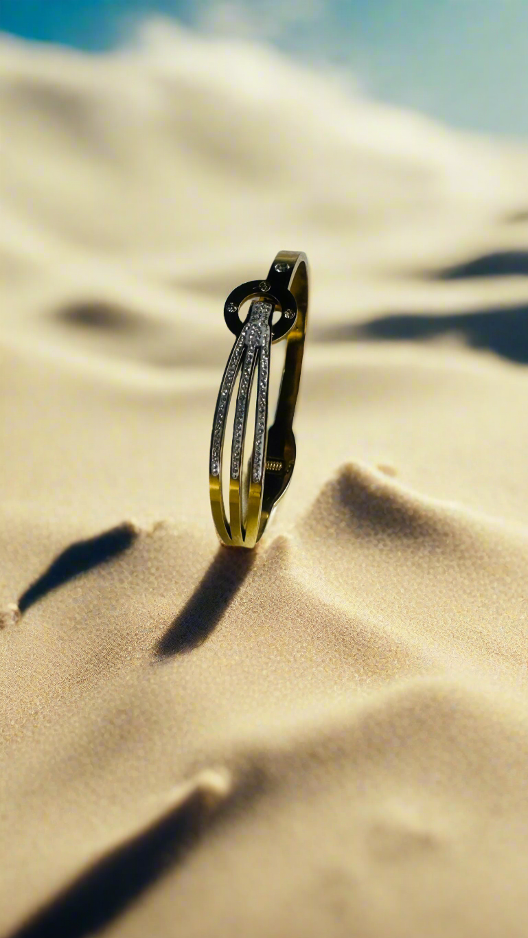 This elegant hand kada features a polished gold-tone finish with a modern open design, highlighted by shimmering crystal embellishments. Crafted for comfort and style, it blends traditional charm with contemporary elegance. Perfect for festive occasions or elevating everyday wear with a touch of luxury.