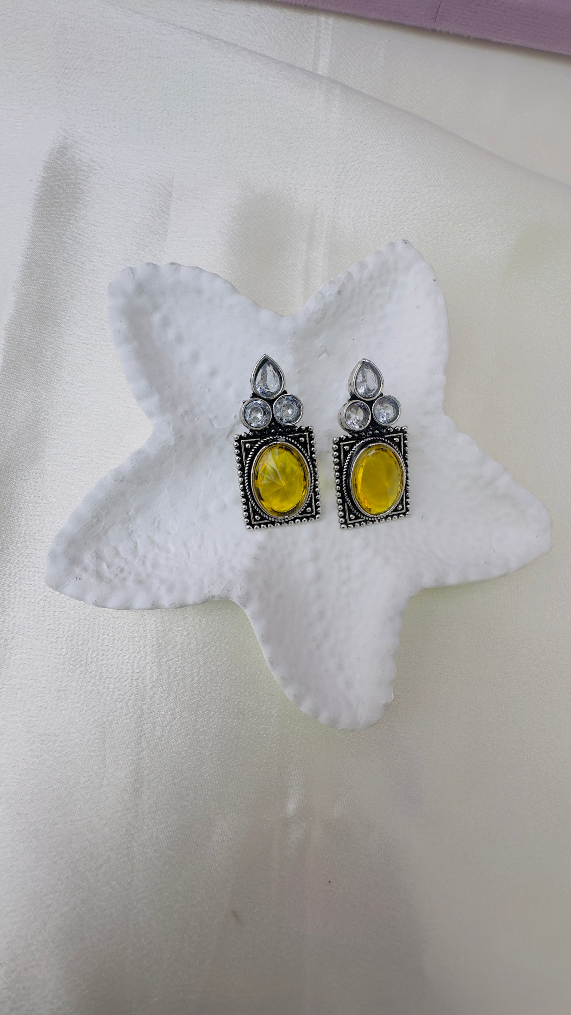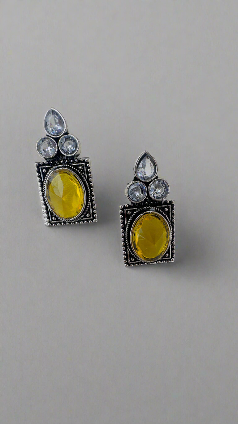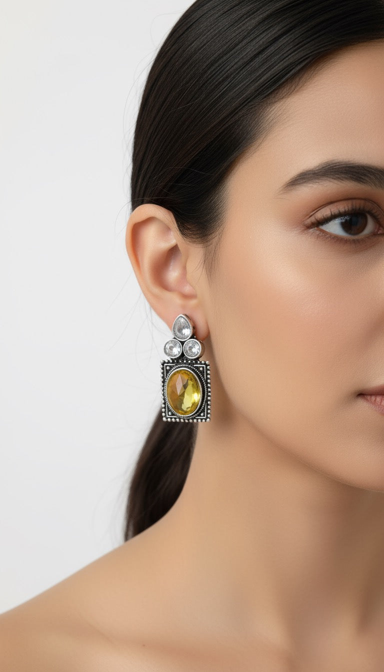 These earrings blend classic oxidized silver with vibrant yellow and crystal-white stones, creating an elegant yet bold accessory. The rectangular silhouette and intricate beaded detailing around the frame add to their regal charm, while the yellow stone gives a touch of sunshine to any look