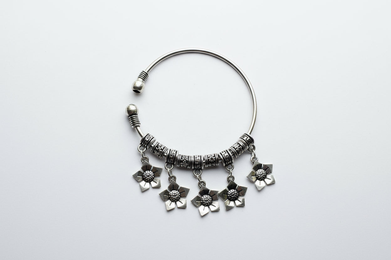 Graceful and timeless, the Silver Blossom Charm Cuff features a sleek open bangle design adorned with delicately dangling floral charms. Each flower is intricately detailed, creating soft movement and a gentle shimmer with every gesture. The engraved accents along the band add a touch of vintage elegance, making it perfect for both everyday wear and special occasions.